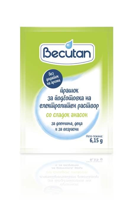BECUTAN electrolyte with sweet fennel for infants, children and adults is a powder for preparation of oral solution for rehydration and is intended to compensate for water and electrolyte losses in diarrhea and vomiting. BECUTAN electrolyte with sweet fennel is a mixture of minerals, glucose and sweet fennel fruit extract, which additionally helps in conditions of indigestion. At the same time, the sweet fennel extract is an excellent flavor enhancer and makes the solution tasty and pleasant to drink. The electrolyte BECUTAN with sweet anise is without the addition of aromas and is recommended for the youngest, infants and children up to 12 months of age, but also for all ages.